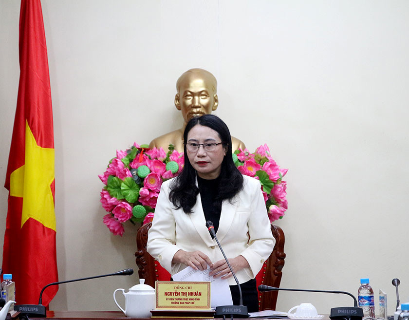Trưởng ban Pháp chế HĐND tỉnh Nguyễn Thị Nhuần phát biểu tại cuộc làm việc. |