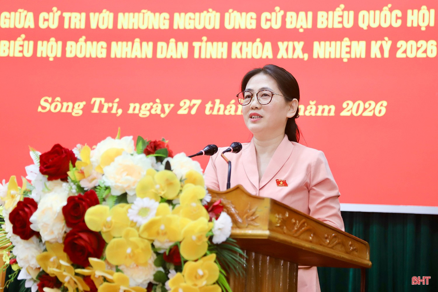 Bà Phan Thị Nguyệt Thu trình bày chương trình hành động tại hội nghị tiếp xúc cử tri của những người ứng cử ĐBQH khóa XVI và đại biểu HĐND tỉnh khóa XIX tại đơn vị bầu cử số 1 (phường Sông Trí). |