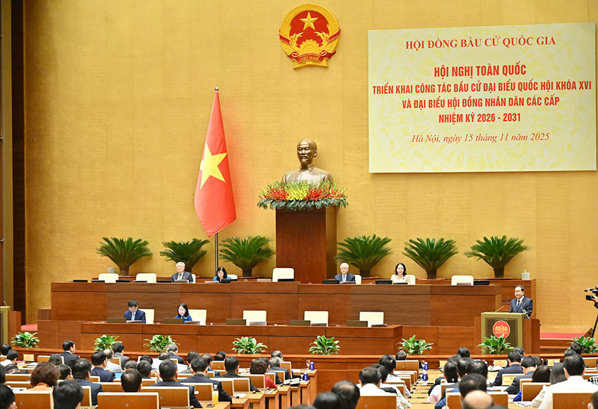 Tổng Bí thư Tô Lâm dự và chỉ đạo hội nghị; Chủ tịch Quốc hội, Chủ tịch Hội đồng bầu cử quốc gia Trần Thanh Mẫn chủ trì và điều hành hội nghị |