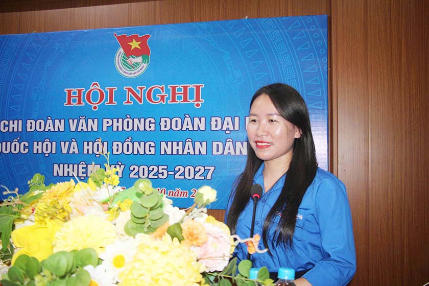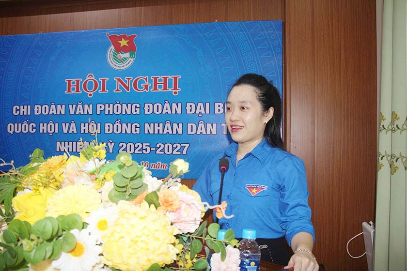 Phó Bí thư Chi Đoàn Văn phòng Đoàn ĐBQH và HĐND tỉnh Đặng Thị Quỳnh Thơ trình bày báo cáo tổng kết hoạt động của Chi đoàn nhiệm kỳ 2024- 2027 đến nay và phương hướng, nhiệm vụ nhiệm kỳ 2025-2027 |