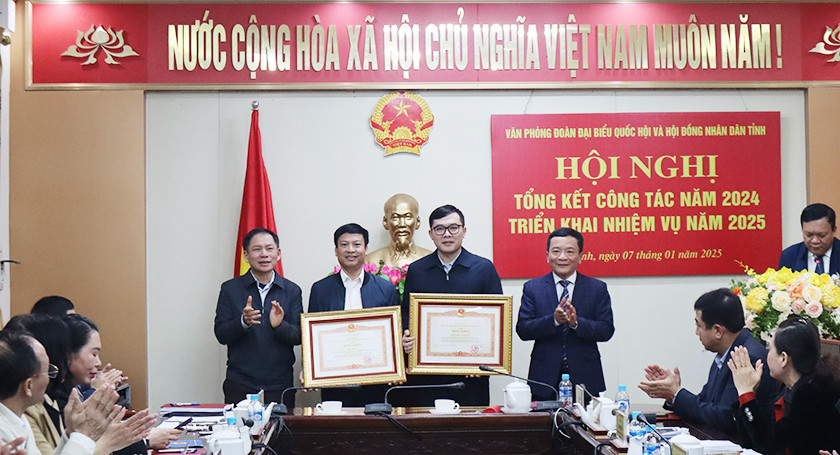 Phó Chủ tịch HĐND tỉnh Trần Văn Kỳ và Phó Trưởng đoàn chuyên trách Đoàn ĐBQH tỉnh Trần Đình Gia trao bằng khen của Thủ tướng Chính phủ tặng Bằng khen cho tập thể và cá nhân có thành tích xuất sắc trong thực hiện nhiệm vụ giai đoạn 2019 – 2023 |