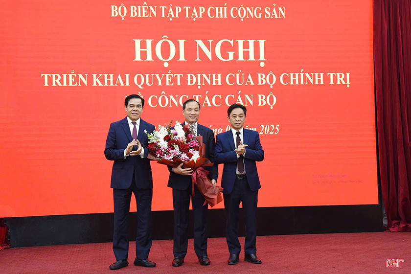 Các đồng chí Phó Tổng Biên tập Tạp chí Cộng sản tặng hoa chúc mừng đồng chí Hoàng Trung Dũng ( ảnh baohatinh.vn) |