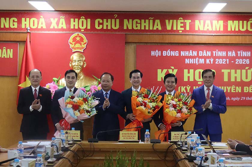 Bí thư Tỉnh ủy Nguyễn Duy Lâm, Phó Bí thư Thường trực Tỉnh ủy Nguyễn Hồng Lĩnh và Chủ tịch UBND tỉnh Võ Trọng Hải tặng hoa chúc mừng Chánh Văn phòng UBND tỉnh Trần Viết Hải, Giám đốc Sở Khoa học và Công nghệ Lê Thành Đông, Chánh Thanh tra tỉnh Nguyễn Thanh Điện được bầu bổ sung các Ủy viên UBND tỉnh |