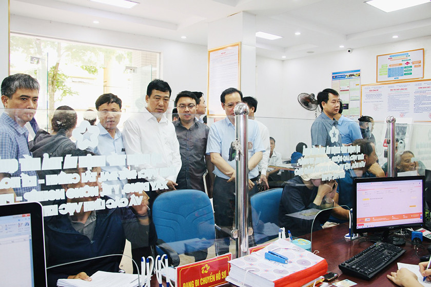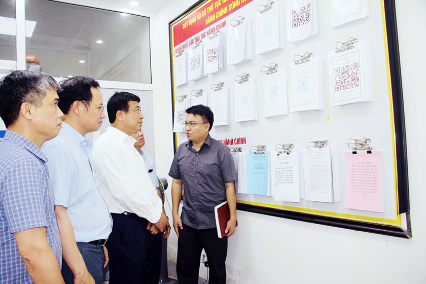 Đoàn công tác trao đổi với người dân, kiểm tra cơ sở vật chất, trang thiết bị, công tác niêm yết các thủ tục hành chính tại Trung tâm hành chính công xã Tiên Điền (mới). |