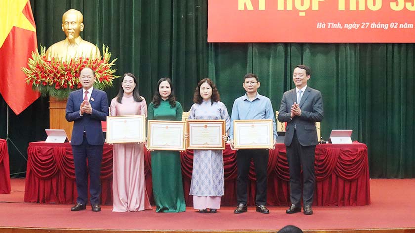 Phó Bí thư Thường trực Tỉnh ủy - Chủ tịch HĐND tỉnh Nguyễn Hồng Lĩnh và Chủ tịch UBND tỉnh Phan Thiên Định trao bằng khen của UBND tỉnh cho 4 tập thể có thành tích xuất sắc trong hoạt động và tham mưu phục vụ hoạt động HĐND tỉnh khóa XVIII nhiệm kỳ 2021–2026 |