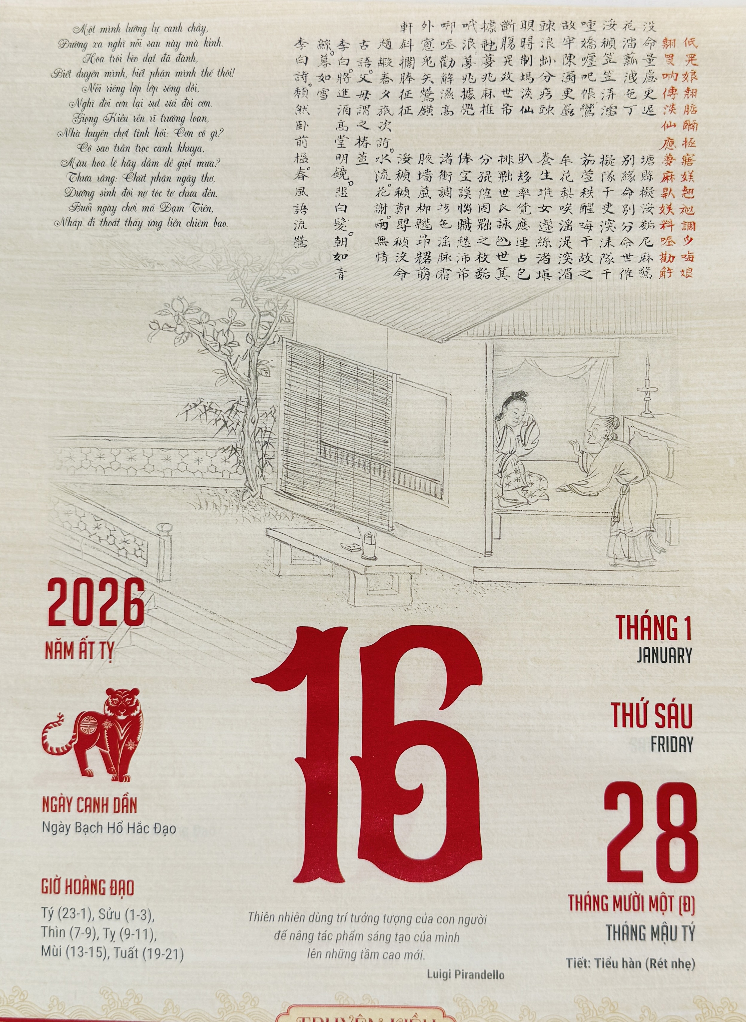 | Trang lịch ngày 16 tháng 01 năm 2026 Nhà xuất bản Chính trị quốc gia Sự thật ấn hành ấn hành năm 2026 và Bìa của cuốn lịch Block Truyện Kiều do Nhà xuất bản Chính trị quốc gia Sự thật ấn hành ấn hành năm 2026 | |